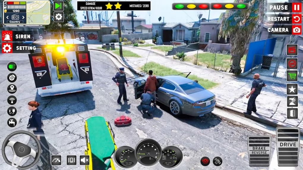 1.玩家扮演一名救护车司机,在繁忙的都市中,面对各种紧急情况;