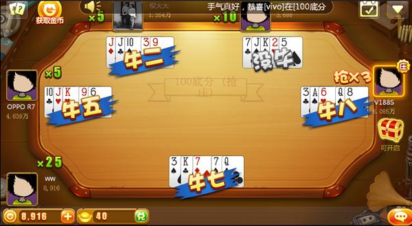 很多初玩牛牛游戏的玩家在仔细看过游戏规则之后,你就会懂得如何组合牌。当然按钮给你发什么牌,或大或小,这是个人运气问题。不过如果你连组牌都不会的话,后果可想而知的。组牌其实就是如何打好你手中的牌,把你手中的牌打出最大牌。组牌也是非常的简单的,只要将任意三张能够组成整数的牌放到一起。剩下的两张也是放到一起,就可以得出牌的大小,最好就可以出牌与庄家比大小。